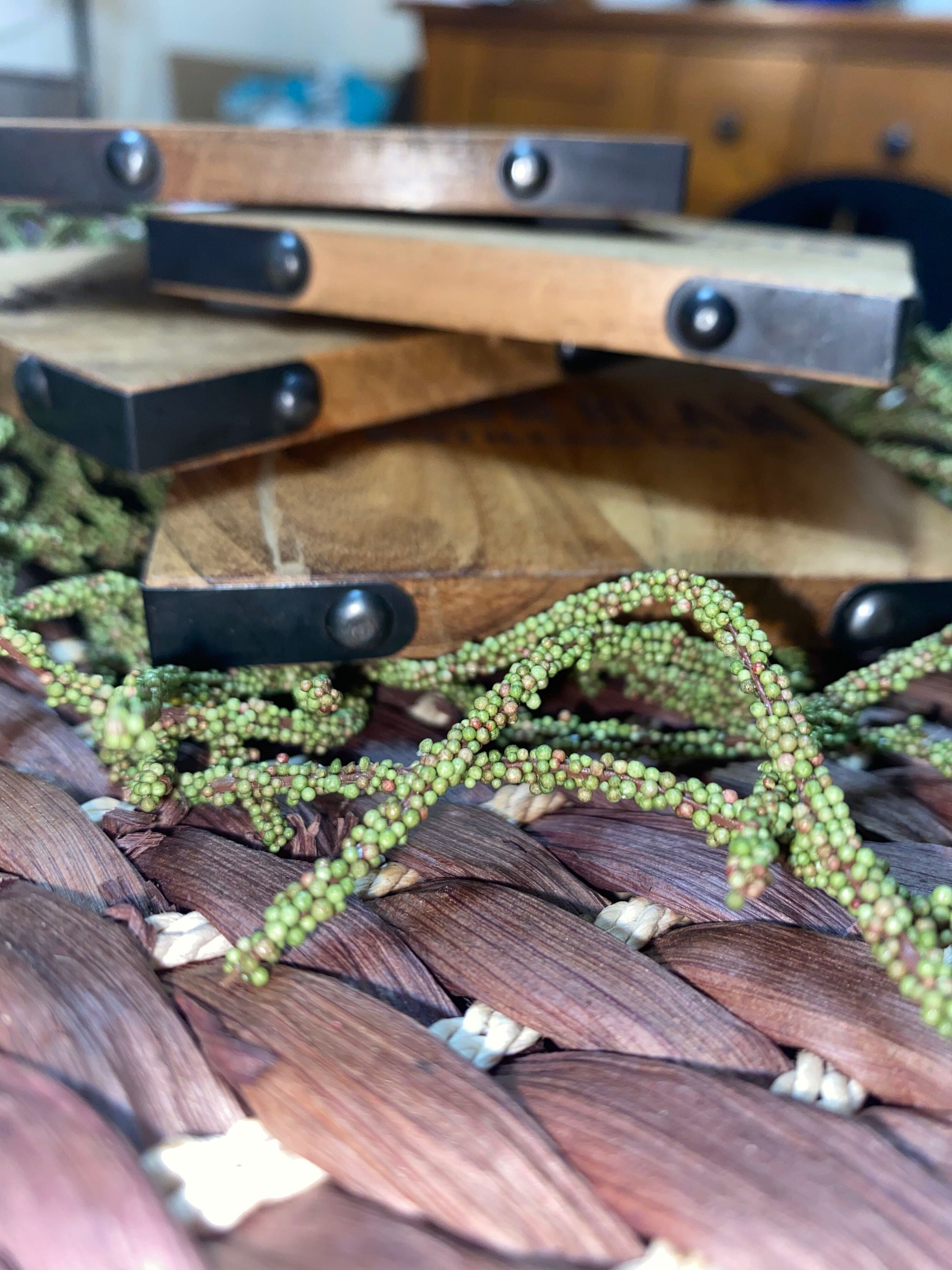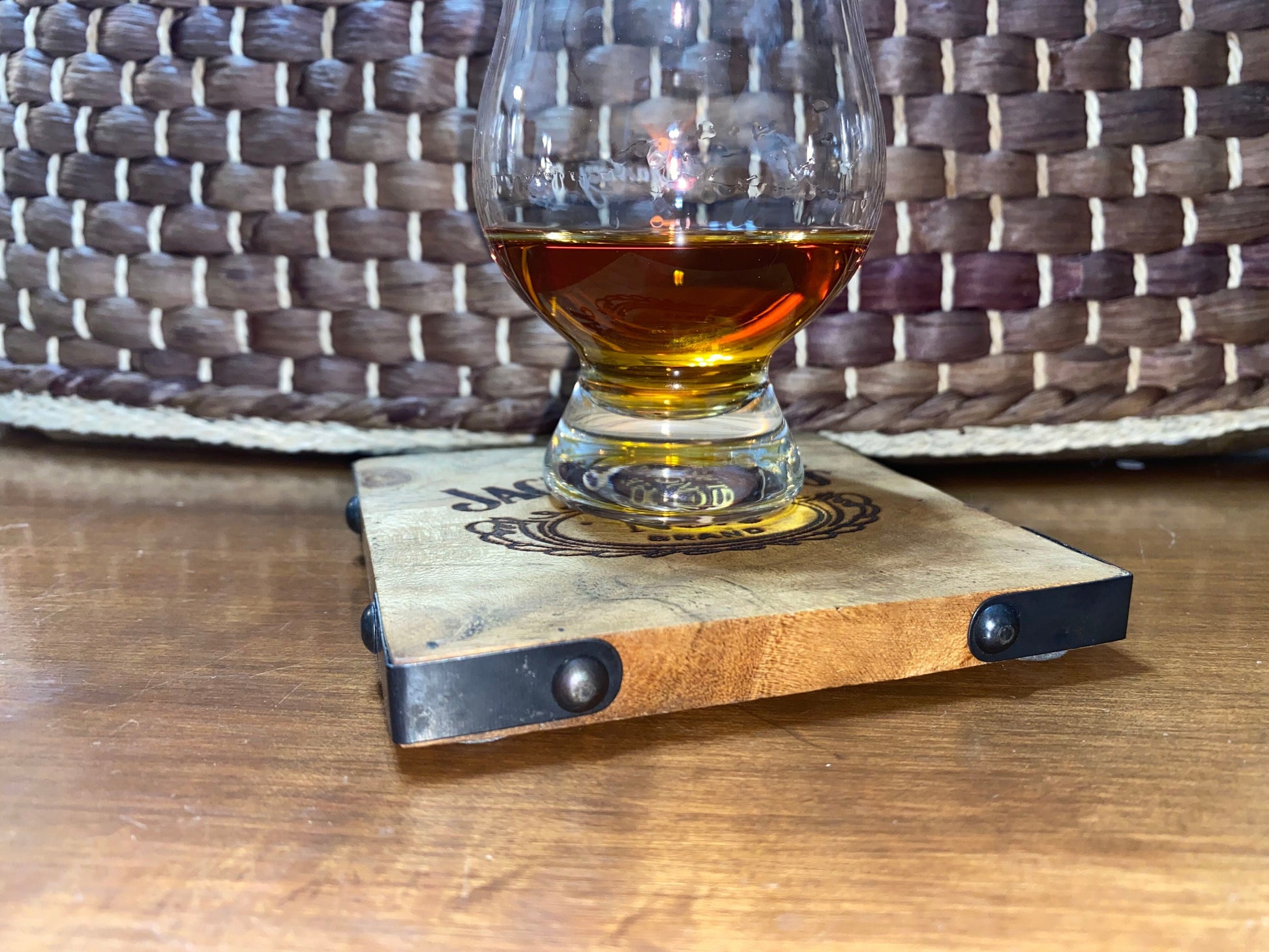 Option 1 is a stylish, contemporary addition to your barware accessories. The logo/image is laser engraved into the wood to give you that robust look to match the metal studded corners on these coasters. They will fit perfectly with your bourbon-themed room or office! Coasters have feet to avoid damage to surfaces and to prevent sliding. Each coaster measures approx. 4'x4'. Clean with a damp cloth and towel dry.